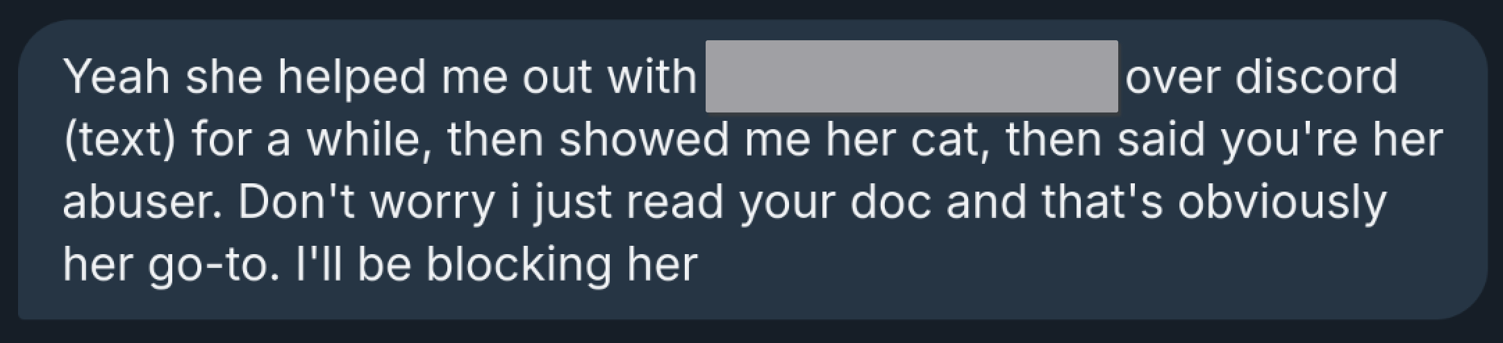 Publicly, Luna has accused me of sabotaging her friendships and harming her ability to trust others. But that narrative is a projection. With the exception of a few conversations with close friends for my own safety, I have not contacted others about her unprompted. Meanwhile, mutuals have reached out to me, sharing similar stories of emotional manipulation and toxicity, many of them having already chosen to distance themselves from her before any of this became public. I’ve become her scapegoat, while she actively undermines my relationships and misrepresents our history.